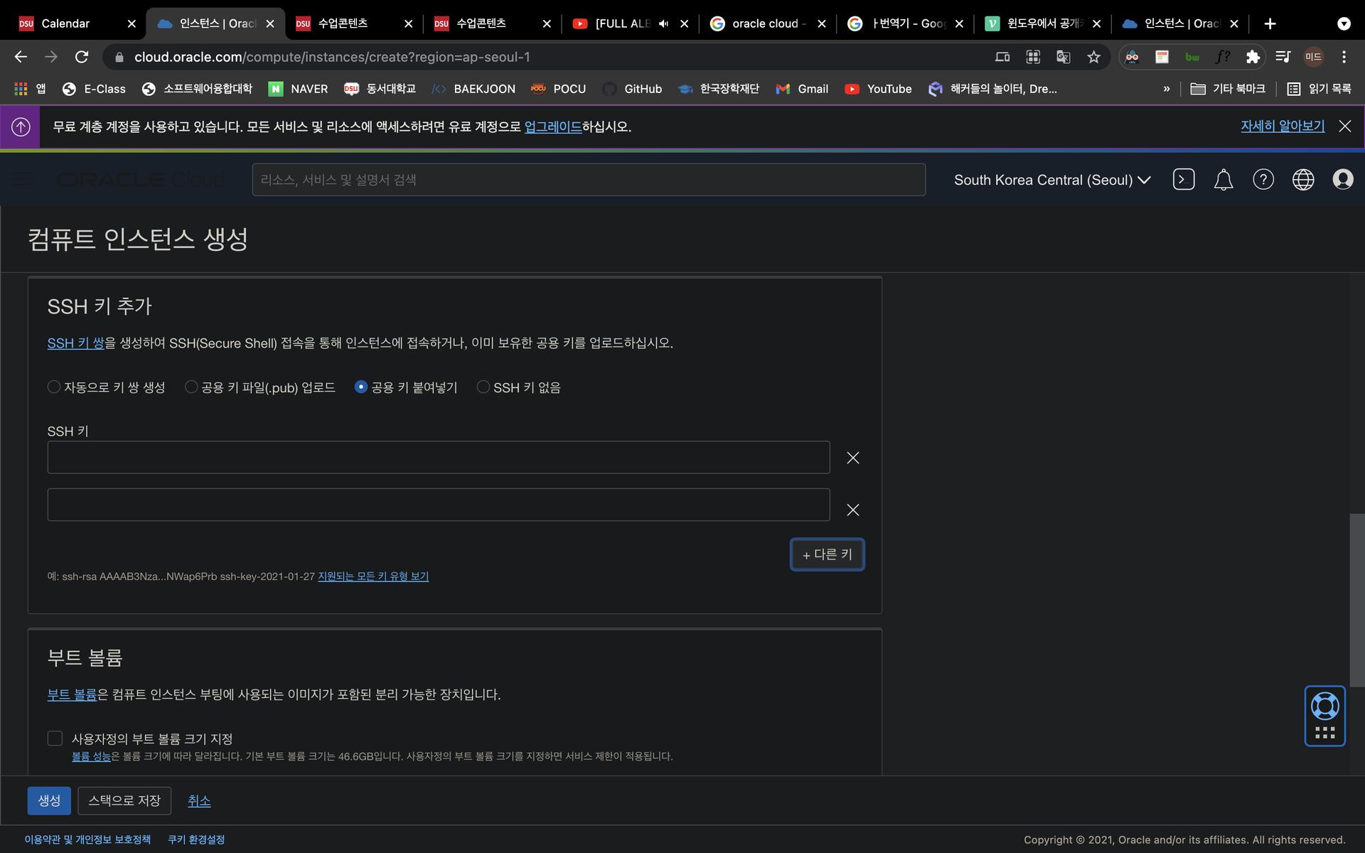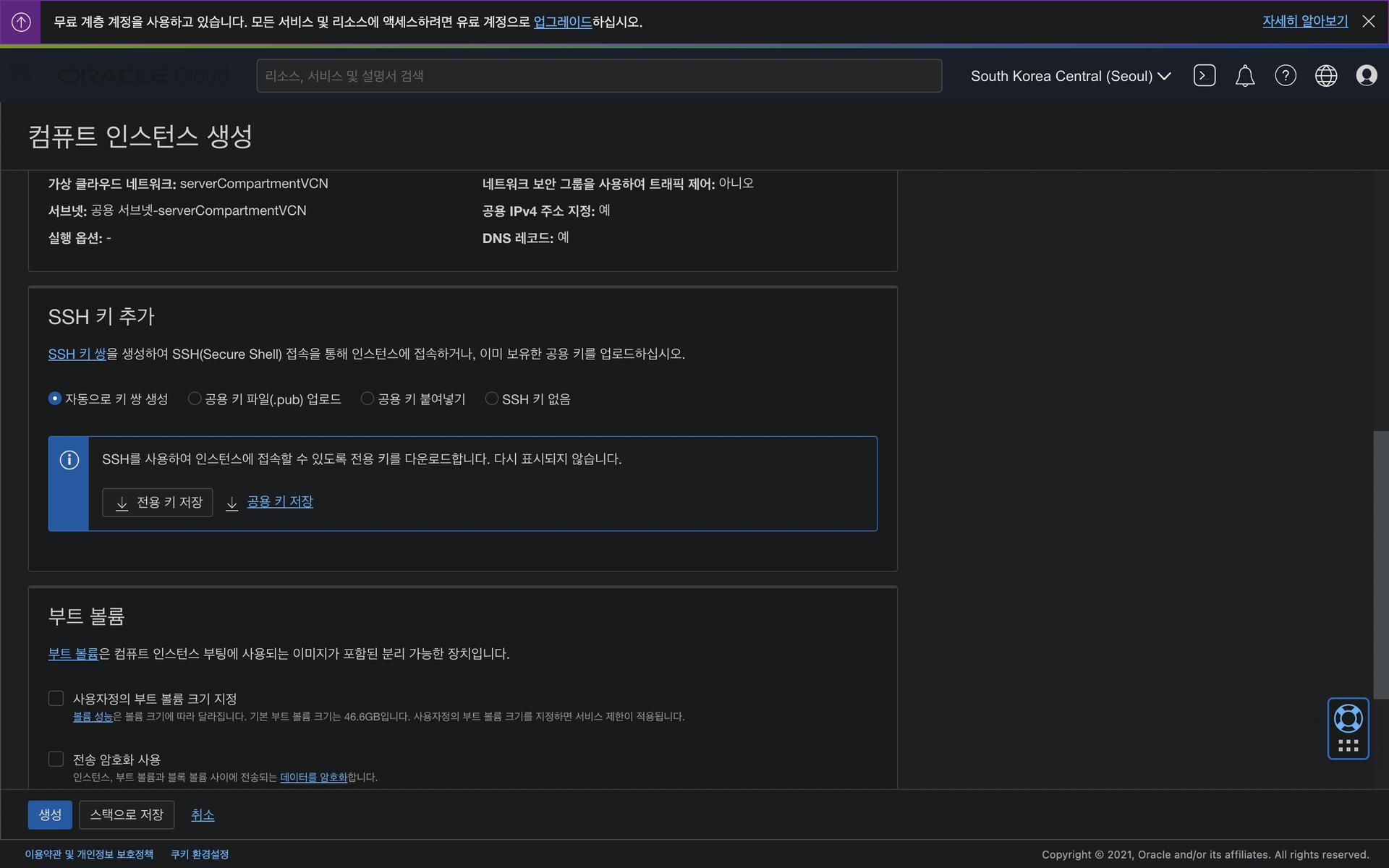 여기에 주로 사용할 (주로 root나 opc에 접속할) ssh 공용키를 넣어주시면됩니다.