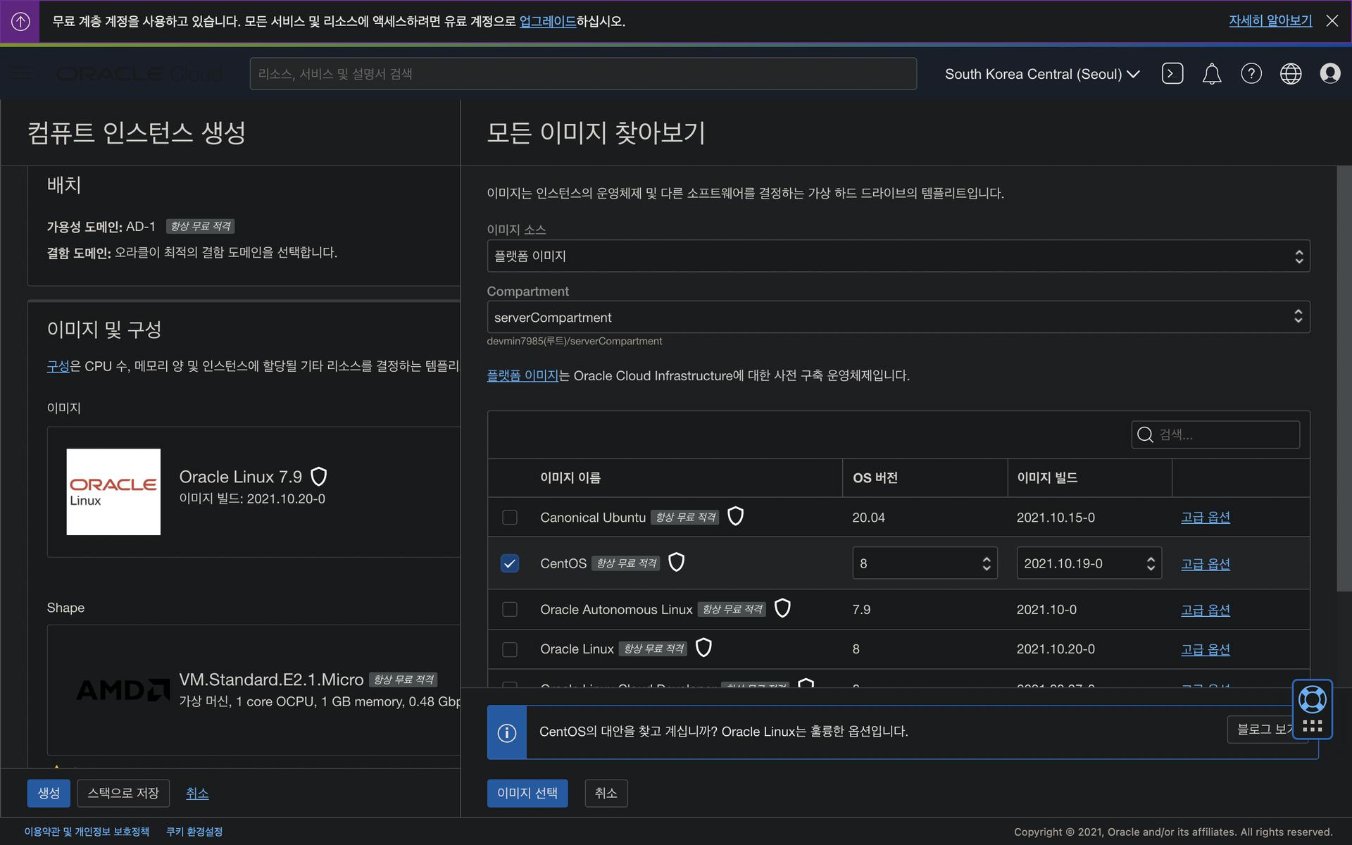 저희가 원하는 OS는 CentOS8입니다. 따라서 아래에 이미지 구성을 변경해봅니다.