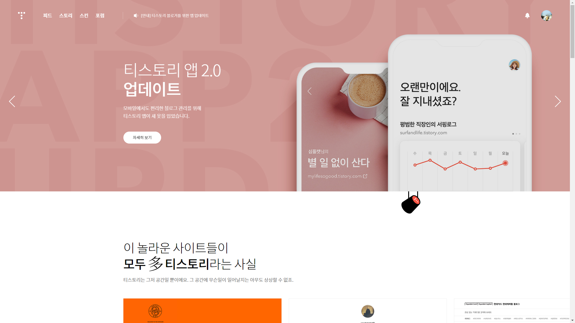 또한 이전에는 티스토리 유저들이 카카오와 다음이 합쳐진 이후로 티스토리가 버려진 것 아니냐는 이야기가 많이 돌았으나 카카오에선 보란듯이 티스토리를 신경쓴다는 문구를 추가하고 지속적인 관리를 진행하고 있다. 일례로 초대장을 완전히 없앤다던지, 새로운 에디터를 추가한다던지, 새로운 테마가 나오거나, 새로운 기능이 나오는 등 네이버에 비하면 느린편이지만 필자는 매우 긍정적으로 생각한다.
