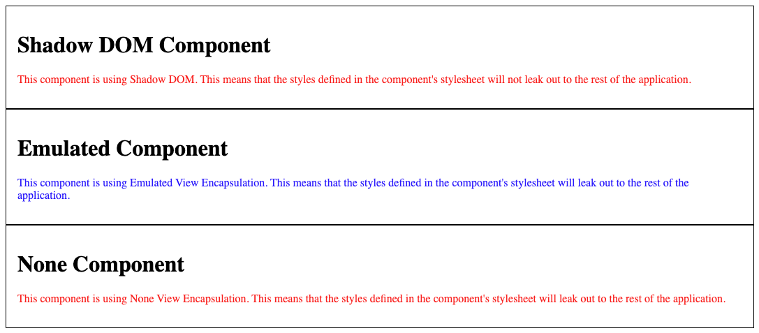 재밌는 점은 생성한 3가지 컴포넌트를 동시에 표기한 경우에 ShadowDom으로 선언한 컴포넌트의 텍스트 색상이 빨간색으로 표시된다. 쉐도우 루트안에 스타일 태그가 생성될 때 모든 컴포넌트가 가지고 있는 스타일이 포함되어 이와같은 현상이 생기는 것으로 보인다.