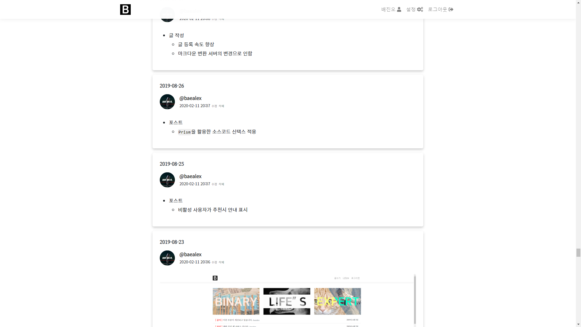 - 글 : 소개(팀 공식 글), 활동(baealex), 활동(baealex), 프로젝트(팀 공식 글), 활동(DeCrazy)