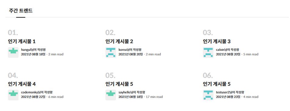 - 인기 포스트는 모든 포스트의 일주일간 조회수를 측정하여 배치하였습니다. 다만 검색량이 높은 글들은 지속적으로 상위에 배치되는 현상이 있습니다. 다양한 글들이 노출될 수 있도록 같은 방식으로 일주일 안에 작성된 포스트 6개만 나열하는 주간 트랜드로 변경하였습니다.