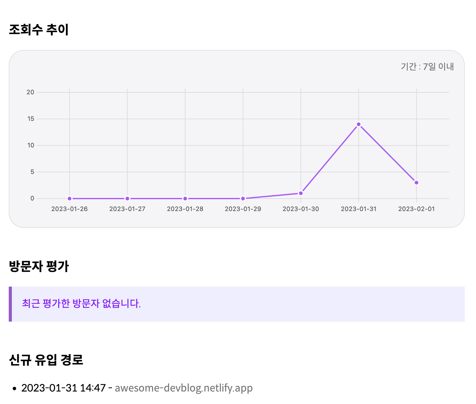 포스트 분석은 포스트 관리 페이지에서만 확인이 가능했는데요. 다양한 곳에서 이동하여 확인할 수 있도록 페이지로 분리하였습니다. 페이지 내부에서는 조회수 추이, 방문자 평가, 유입 경로 등을 확인할 수 있습니다.