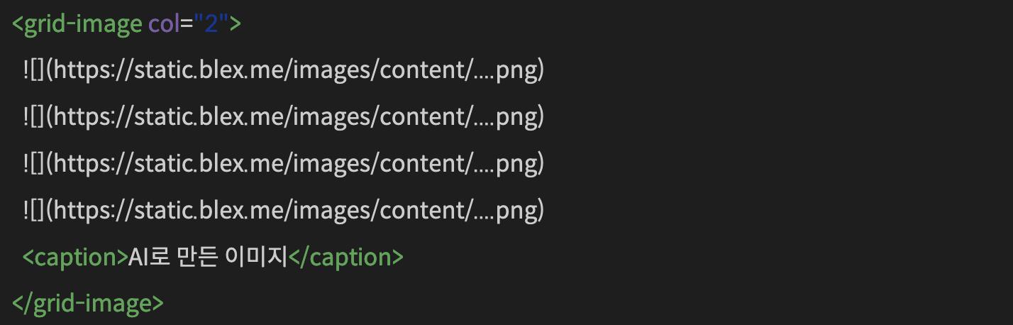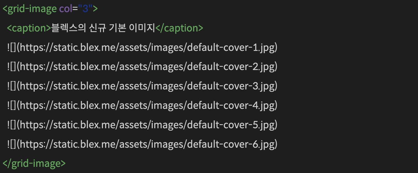 위 예시와 같이 caption은 어느 위치에 작성하던 항상 하단에 표기됩니다. (예시처럼 처음이나 마지막에 위치시키는 것을 권장합니다.) 1줄의 이미지의 경우에는 설명 작성 용도로 활용하기 위해서 지원하고 있습니다. 기존에 center 등으로 작성할 수 있었으나 설명에 대한 디자인이 첨가되므로 더 유용하게 사용할 수 있습니다.