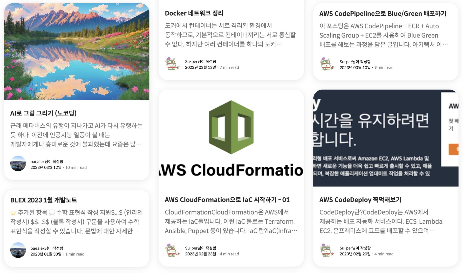 포스트 목록의 높이를 맞추기 위해 보여졌던 기본 이미지가 모두 사라지고 각 카드의 높이에 맞게 레이아웃이 자동으로 정렬되어 보여지도록 개선하였습니다. (사유: 기본 이미지가 많아져 산만해 보이는 느낌을 줌) 모바일에서는 기본 이미지를 숨기도록 조치하였는데 PC에서만 보여지는 것이 어색하게 느껴져 현재와 같은 형태로 변경하였습니다.