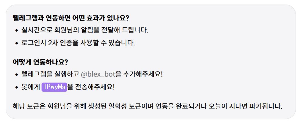 기존에 존재하던 텔레그램 연동 모달도 페이지 형태로 전환되었습니다. 기존에는 서비스 연동시 어떤 기능이 제공되는지 확인할 수 없었으나, 해당 페이지에서 연동 여부와 관계없이 항상 어떤 기능이 제공되고 있는지 볼 수 있습니다.