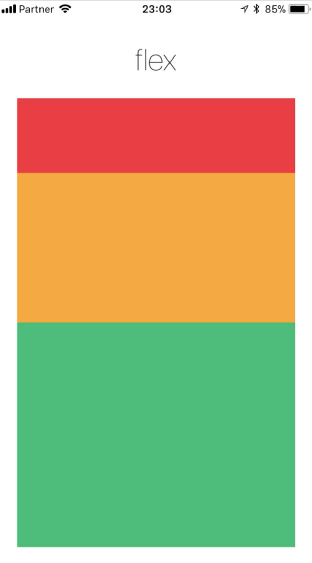 위 레이아웃의 Red는 flex: 1, Orange에는 flex: 2, Green에는 flex: 3이 적용되어있다. 모든 플렉스 값을 더하면 6인데 각 플렉스는 총 플렉스에서 나눠진 값을 크기로 가진다. 즉 Red는 1/6, Green은 3/6의 공간을 가지게 된다. 이 사이즈는 모든 기기에서 반응형으로 동작한다.
