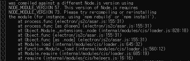 일렉트론에선 분명히 노드 모듈을 사용할 수 있다고 명시되어 있었는데 막상 패키지를 설치하여 실행해보니 아래와 같은 에러가 발생했다.