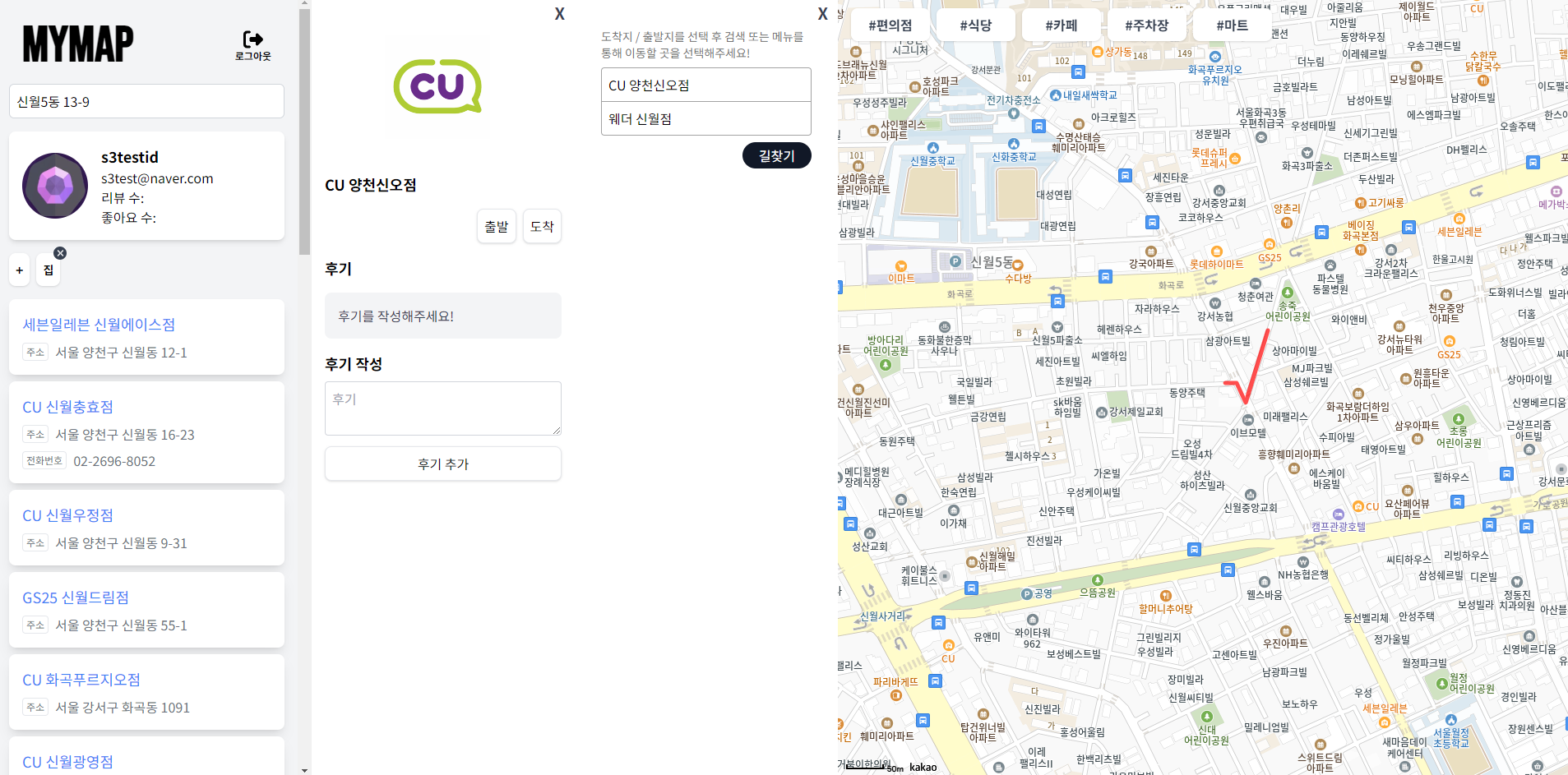 react, express 기반 풀스택 프로젝트 my-map의 경로탐색 기능을 사용한 모습