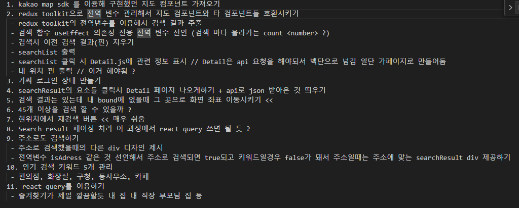 개발 시작 전 한번에 저 내용을 다 적은것이 아니라 1번 내용 적고 그 내용을 구현하고 2번내용을 적고 그 내용을 구현하는 방식이다. 이렇게 하니까 뭔가 어떻게 개발해야 할 지에 대한 막연했던 생각들이 좀 구체화 되는 느낌이고 무엇보다 좋은것은 잠깐 화장실을 간다거나 밥을 먹고 왔을때 내가 뭐하고 있었지 고민 하는 시간이 없어졌다는게 제일 좋은 것 같다. 하지만 좀 부끄러우니 gitignore를 해두긴 했다.