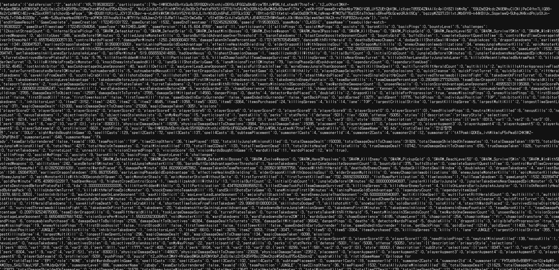 1개의 매치에 대한 정보가 담긴 데이터다 여기에서 필요한 정보는 4-5개 일 것 같은데 어떻게 처리를 해야할지 벌써 좀 막막한 것 같다.