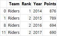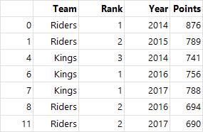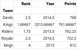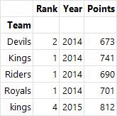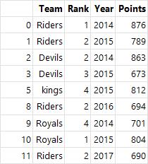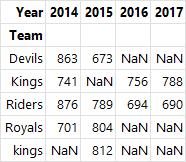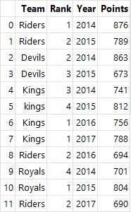 'Team': ['Riders', 'Riders', 'Devils', 'Devils', 'Kings', 'kings', 'Kings', 'Kings', 'Riders', 'Royals', 'Royals',