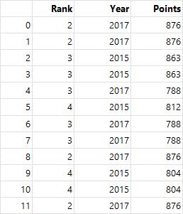 'Rank': [1, 2, 2, 3, 3, 4, 1, 1, 2, 4, 1, 2],