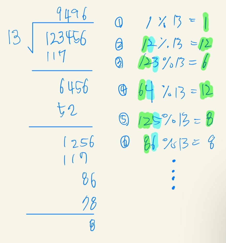 해당 법칙을 소스로 표현하면 왼쪽부터 자릿수를 늘려가면서 나머지를 구하였다.
