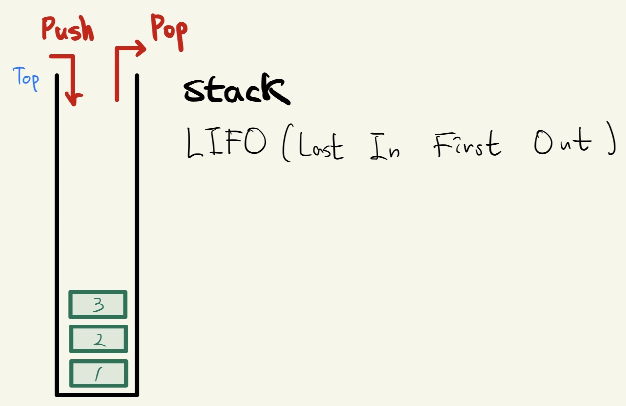 스택(Stack)은 후입선출(LIFO, Last In First Out) 구조를 가지고 있는 자료구조이다. 입력 연산(Push)을 사용하면 Top을 거쳐 순서대로 데이터가 들어가고, 출력 연산(Pop)을 사용하면 Top이 가리키는 데이터, 즉, 가장 마지막에 삽입한 데이터를 가져온다.