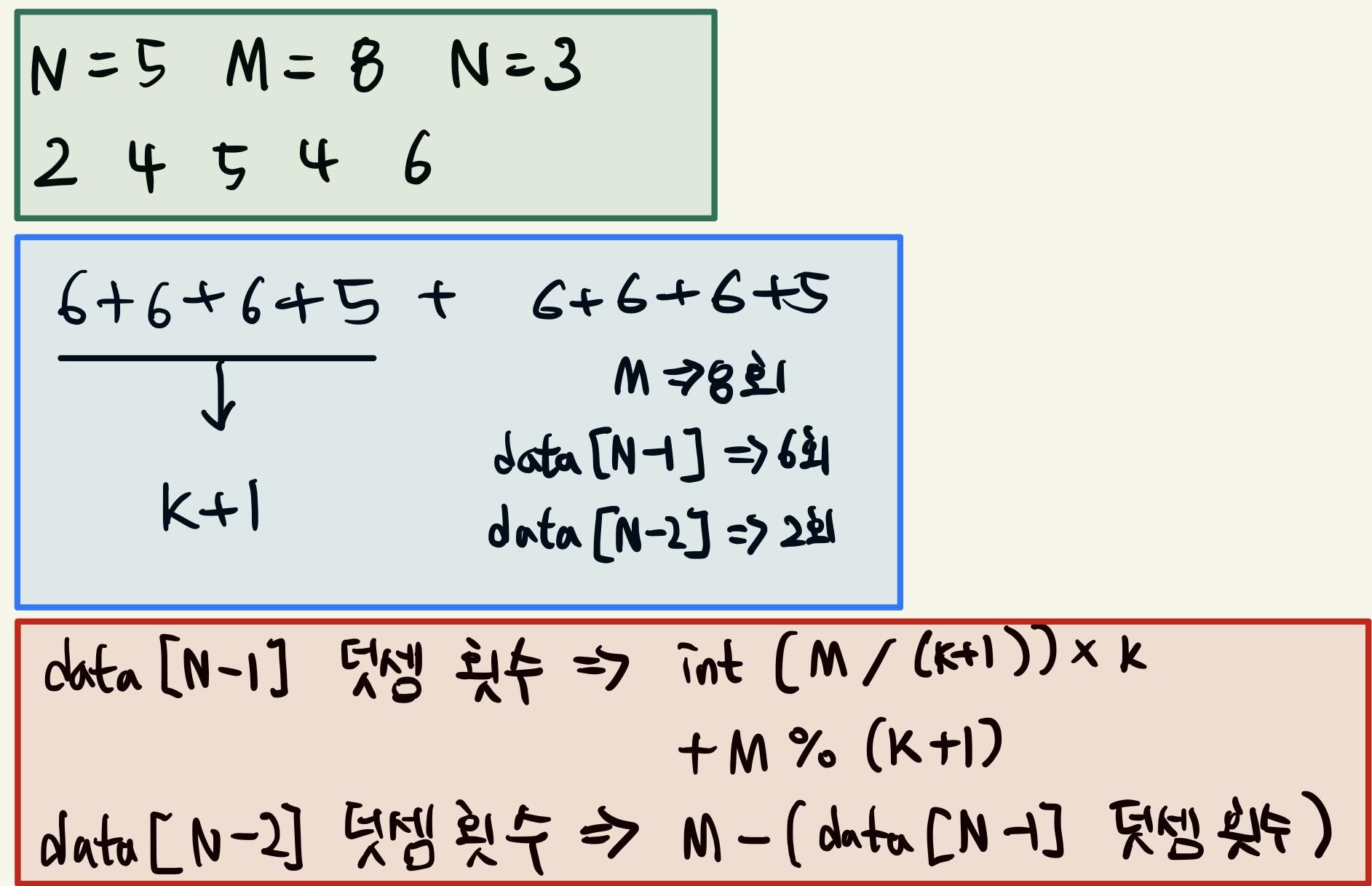 단, 서로 다른 인덱스에 해당하는 수가 같은 경우에도 서로 다른 것으로 간주한다. 예를 들어 순서대로 3, 4, 3, 4, 3으로 이루어진 배열이 있을 때 M이 7이고, K가 2라고 가정하자. 이 경우 두 번째 원소에 해당하는 4와 네 번째 원소에 해당하는 4를 번갈아 두 번씩 더하는 것이 가능하다. 결과적으로 4 + 4 + 4 + 4 + 4 + 4 + 4인 28이 도출된다.