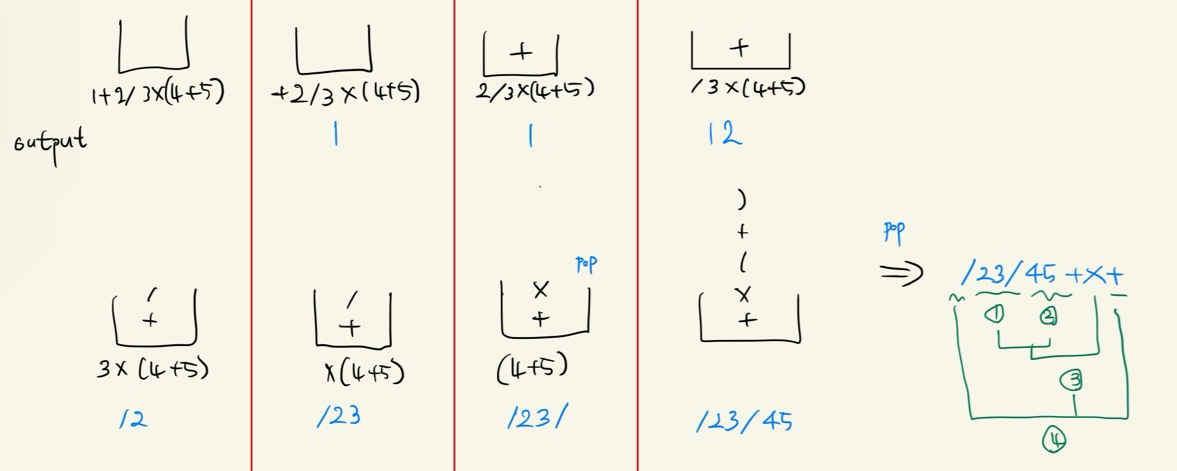 pop하여output에push,operator stack에 탐색한 연산자를push하는 방식 - 후위 표기법 계산은 왼쪽부터