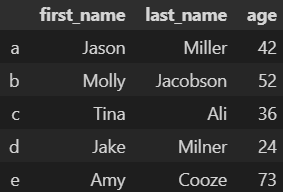 import pandas as pd raw_data = {'first_name': ['Jason', 'Molly', 'Tina', 'Jake', 'Amy'], 'last_name': ['Miller', 'Jacobson', 'Ali', 'Milner', 'Cooze'], 'age': [42, 52, 36, 24, 73]} df = pd.DataFrame(raw_data, index=['a', 'b', 'c', 'd', 'e']) df["a"]
