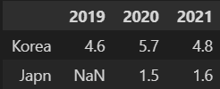 nested_dict = {'Korea': {2019: 4.6, 2020: 5.7, 2021: 4.8}, 'Japn': {2020: 1.5, 2020: 1.5, 2021: 1.6}} df = pd.DataFrame(nested_dict).T # 전치 메소드- 답 : 1