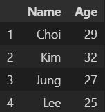 data = [['Choi', 29], ['Kim', 32], ['Jung', 27], ['Lee', 25]] df = pd.DataFrame(data, columns=['Name', 'Age'], index=[1, 2, 3, 4])