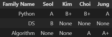 df = pd.DataFrame(data=[['Seol', 'A', 'B', None], ['Kim', "B+", None, None], ['Choi', 'B+', None, 'A'], ['Jung', 'A', None, 'A+']], columns=['Family Name', 'Python', 'DS', 'Algorithm']) df = df.set_index('Family Name').T