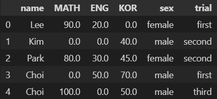 df = pd.DataFrame(data=[['Lee', 90.0, 20.0, 0.0, 'female', 'first'], ['Kim', 0.0, 0.0, 40.0, 'male', 'second'], ['Park', 80.0, 30.0, 45.0, 'female', 'second'], ['Choi', 0.0, 50.0, 70.0, 'male', 'first'], ['Choi', 100.0, 0.0, 50.0, 'male', 'third']], columns=['name', 'MATH', 'ENG', 'KOR', 'sex', 'trial']) df