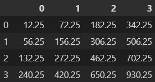 - 다음 실행 결과와 같은 데이터프레임이 존재할 때, 데이터프레임과 각 데이터프레임의 행의 평균에 대한 합의 제곱을 구하기 위한 코드로 올바른 것은?