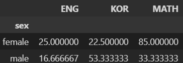 pd.pivot_table(df, index=["sex"], aggfunc=np.mean)- 설명 : 1번만 문법상 문제가 없음
