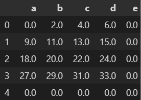 df1 = pd.DataFrame(np.arange(25).reshape(5, 5), columns=list("abcde")) df2 = pd.DataFrame(np.arange(16).reshape(4, 4), columns=list("abcd"))