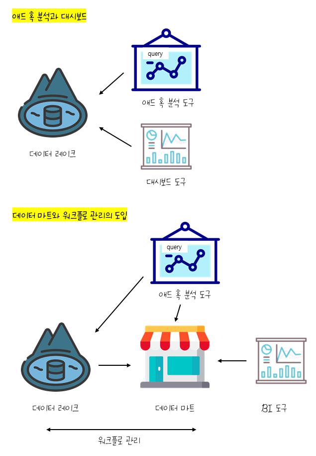 복잡한 데이터 분석에서는 먼저 데이터 마트를 구축한 후에 분석하거나 시각화하도록 한다. 특히 시각화에 BI 도구를 사용할 경우는 집계 속도를 높이기 위해 데이터 마트가 거의 필수적이다. 데이터 마트 구축은 배치 처리로 자동화되는 경우가 많기 때문에 그 실행 관리를 위해 워크플로 관리 도구를 사용한다.