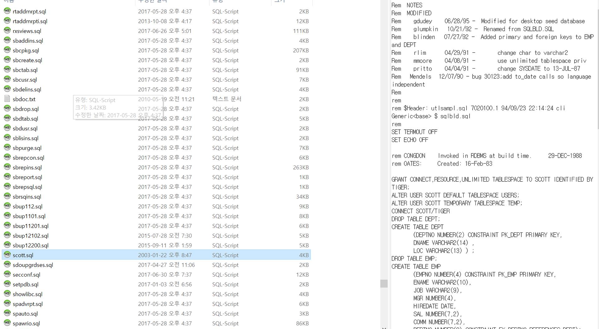 그래서 꿈꾸는 개발자, DBA 커뮤니티 구루비 (gurubee.net)를 다시 보면서 SCOTT 스크립트를 실행했다. 에러는 나오는게 없어서 다시 확인을 해보니 위 모습과 달라진게 없었다.
