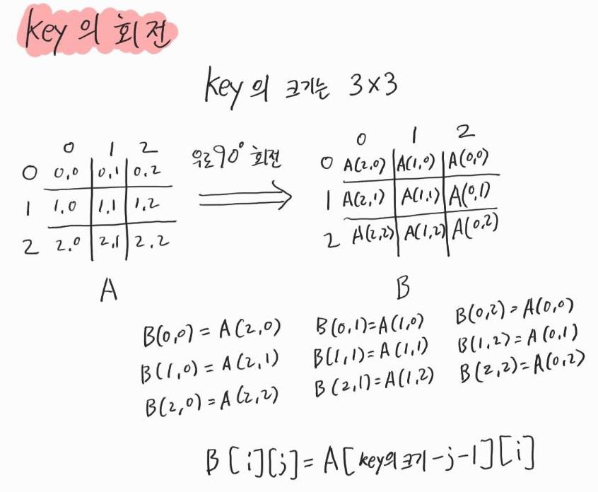- 자물쇠의 행렬 변환(90º 돌리는 행위)을 구현해야 한다.