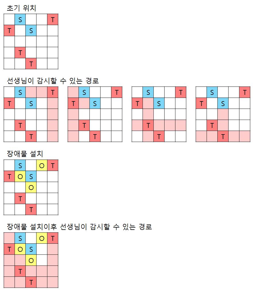 지금까지 풀어봤던 DFS문제랑은 푸는 방식이 조금 다르다. 지금까지 풀어본 문제들은 DFS를 호출할 때마다 4방향(상하좌우)를 확인해야했다. 다만 이 문제에서는 DFS를 실행할 때마다 상하좌우를 확인하는 것이 아닌 맨 처음에 실행할때만 상하좌우를 확인하고 그 후부터는 장애물이나 학생을 만날때까지 같은 방향만 탐색한다.