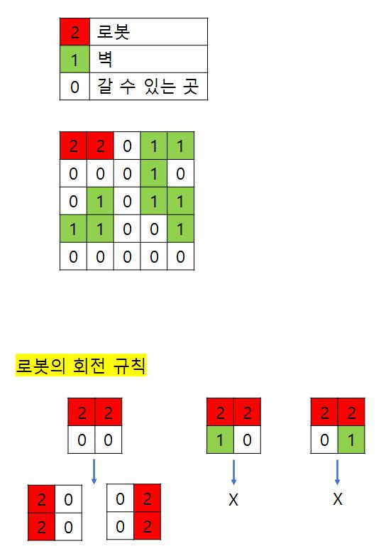 - 로봇의 이동 조건과 회전 조건을 분리하고 이동 조건과 회전 조건이 가능한 경우를 전부 고려해서 작성하면 한 번에 풀 수 있었을텐데.