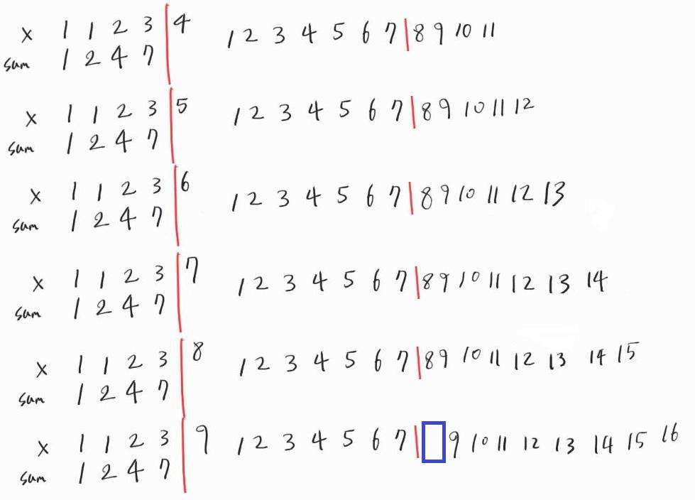 다시 말해, 현재 값을 다 더한 것까지는 동전을 조합해서 만들 수 있다. 따라서 현재 값을 다 더한 것 + 1이 만들 수 없는 최솟값이다. 즉 다음에 더하는 값이 현재값의 합 + 1보다 크면 만들 수 없는 값이 나온다.