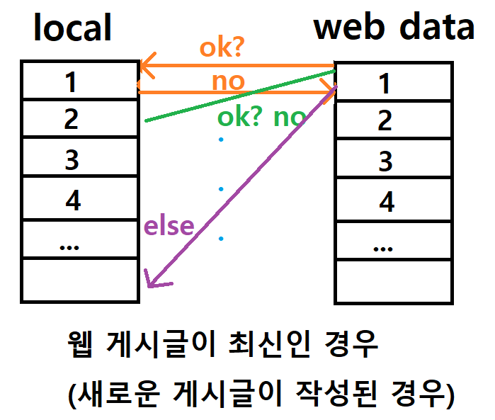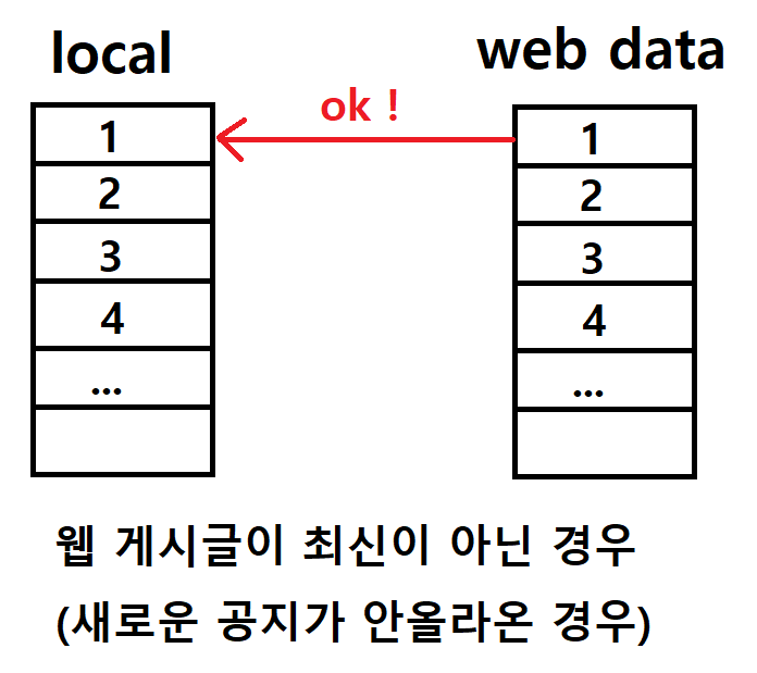 그리고 최신 게시글을 판단하는 부분에서 로컬의 값 3~5개 정도와 크롤링한 데이터를 비교하는 보조 검사대를 만들자.
