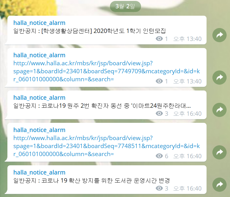 bot.sendMessage(chat_id=my_chat_id, text="일반공지 : " + post.text)