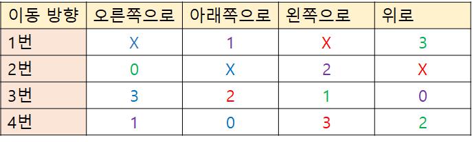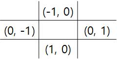 바람의 방향을 오른쪽, 아래쪽, 왼쪽, 위쪽 순서로 생각하면, (0, 1, 2, 3) 인덱스가 할당된다.