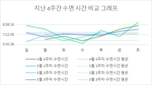 자발적 공부시간만 집계하였습니다. - 4월 25일부터 회사를 다니게 되어 공부하는 시간이 유동적으로 변하였습니다. 그래서 앞으로는 따로 공부하는 시간을 기록하지는 않고 수면 시간만 기록하고자 합니다.