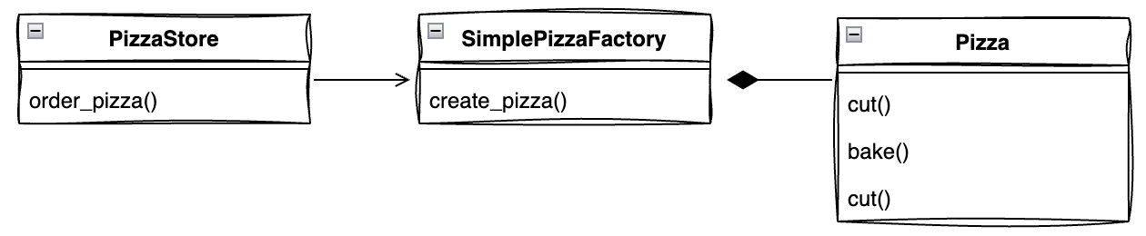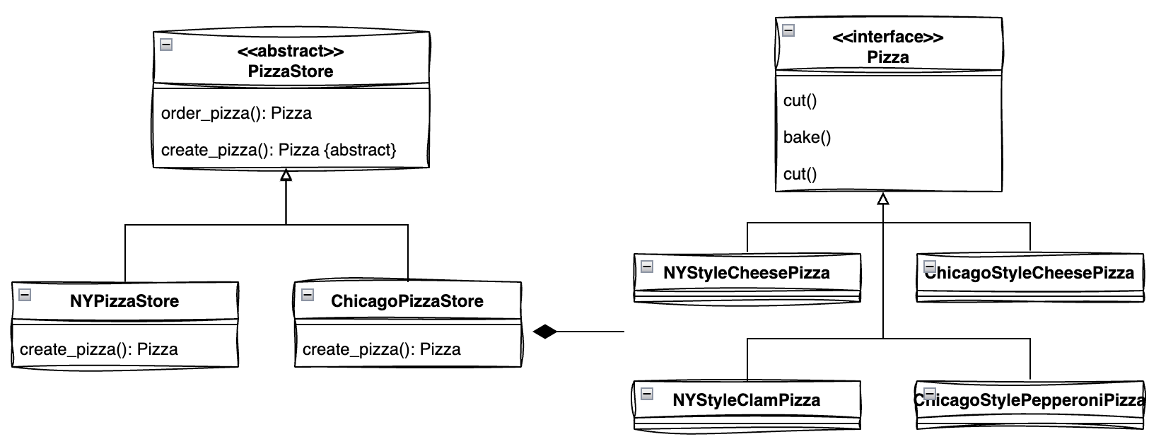 Factory Method는 create 메소드를 추상 메소드로 선언하여 자식 클래스(서브 클래스)에서 결정하도록 한다. PizzaStore를 사용하는 코드에서는 어떤 PizzaFactory를 사용할지 고민하지 않아도 된다. PizzaStore에게 order_pizza 메소드를 요청하면 PizzaStore는 알아서 서브 클래스를 통해 Pizza를 만들고 pizza를 prepare, bake, cut해준다. (구체적으로 말하면, PizzaStore는 추상 클래스이고, PizzaStore를 호출하는 코드는 NYPizzaStore를 호출할 것이다. PizzaStore 클래스에서는 호출자가 NYPizzaStore, ChicagoPizzaStore 중 어떤 것을 선택했는지 알 필요가 없다.)