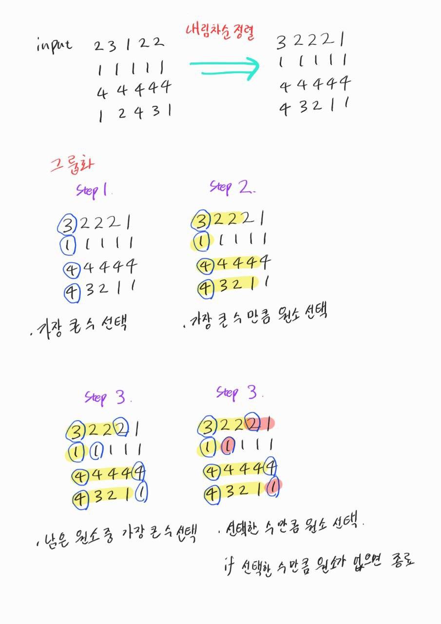 한 그룹에서 가장 공포도가 큰 수만큼 그룹의 인원수를 조정해야한다. 따라서 공포도를 내림차순 정렬하였다. 그리고 모험가 중 가장 큰 공포도만큼 그룹을 짓는 행위를 반복했다.