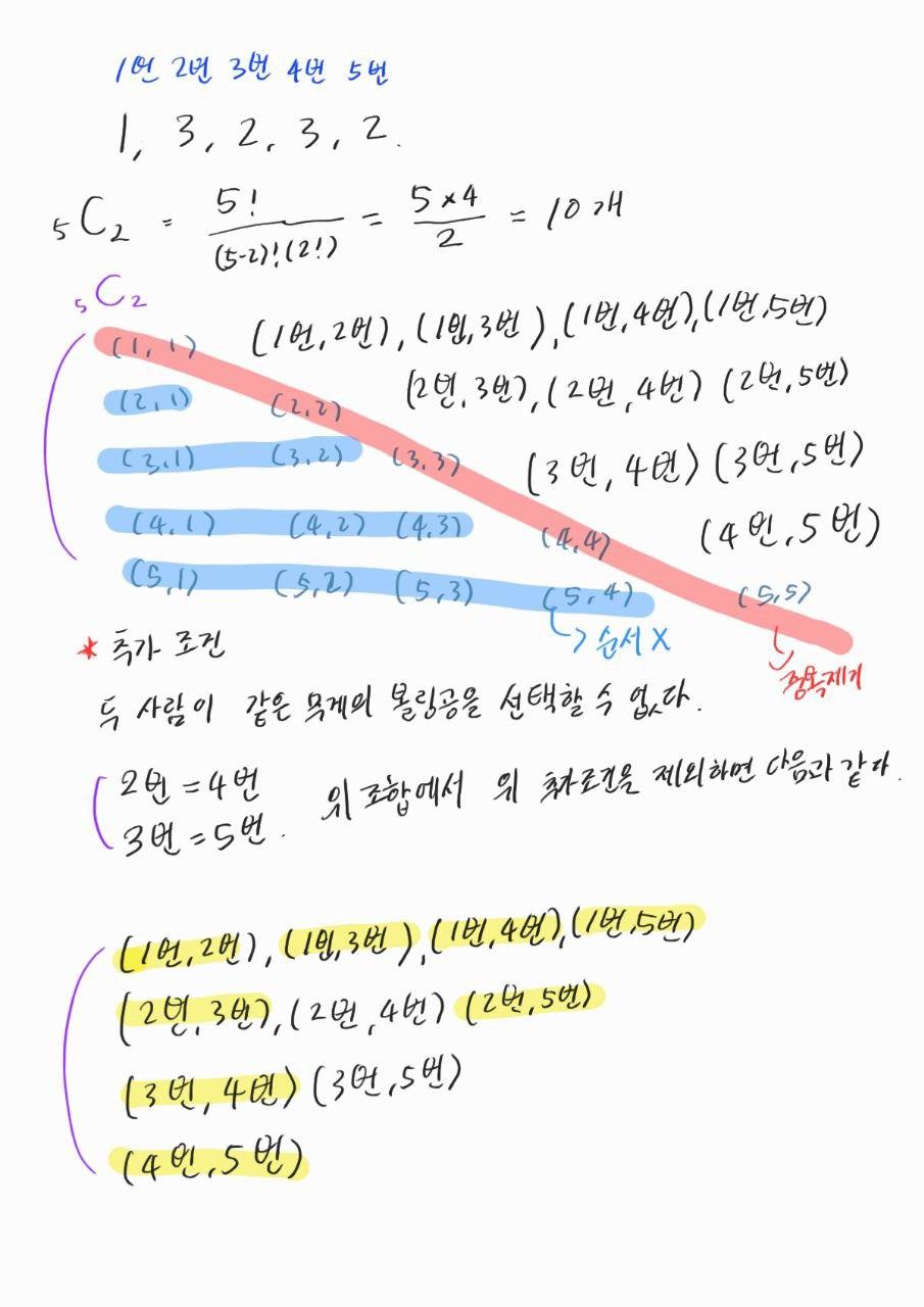 • 즉, N개의 볼링공의 조합을 구한다. -> 구한 조합에서 볼링공의 무게가 같은 경우를 제외한다.