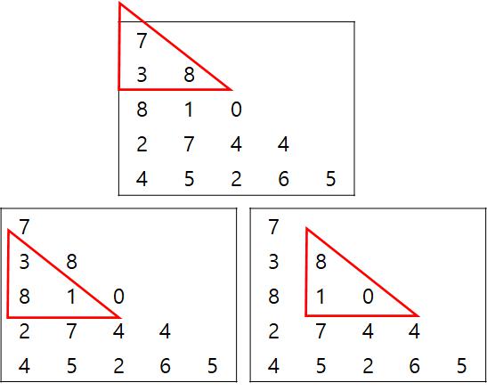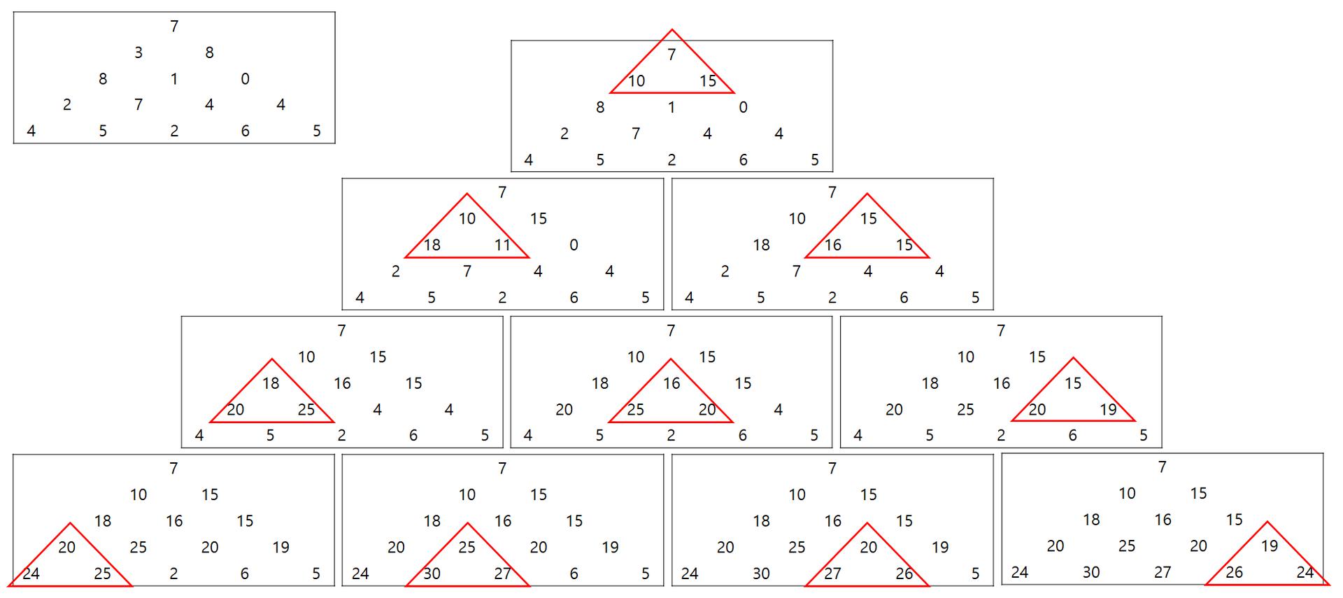 그런데, 31번에서 푼 방식처럼, 아랫층 값을 구성할 수 있는 윗층 값들을 비교한 후 더 큰 값과 아랫층 값을 더해서 최상의 결과를 구하는 것이 연산 횟수도 적고, 빠르지 않을까?