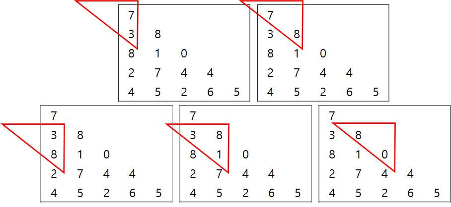 그럼 $dp_{(n, m)} = max(dp_{(n-1, m-1)}, dp_{(n-1, m)}) + array_{(n, m)}$ 이런 공식이 나온다.