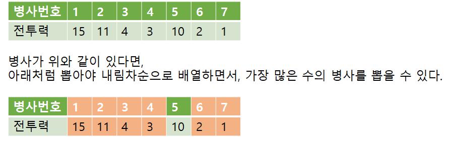• 지금까지의 DP 문제들이 남아있는 수들의 합 중 최대를 구하라는 내용이었다. 그래서 이 문제도 병사의 수가 최대가 되도록남아 있는 병사의 합이 최대가 되도록이라고 잘못 해석해서 틀렸다.
