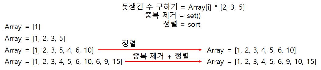 - 두번째는, 리스트에 1을 넣고 2, 3, 5를 곱해주고 리스트에 다시 넣는 것을 반복한다. 이 과정에서 중복되는 수를 제거하기 위해 set 자료형을 사용하고, 다시 list 자료형으로 형변환을 하면서 정렬을 수행했다.