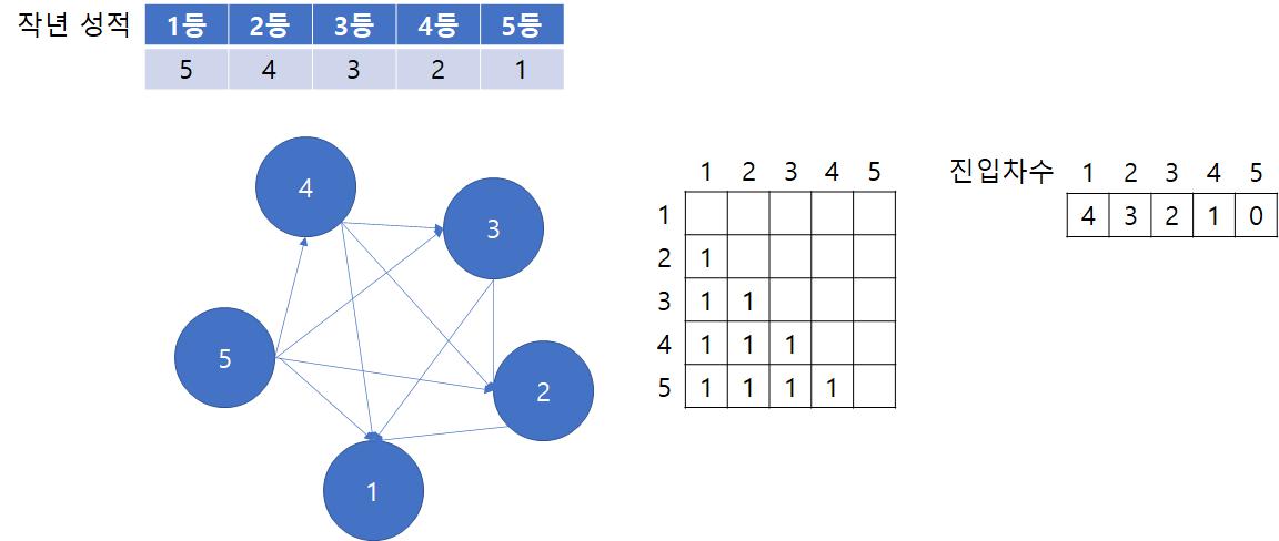 정답으로 올해의 성적을 1등부터 출력해야하기 때문에, 1등의 진입차수를 0이라고 생각하고 표현했다.
