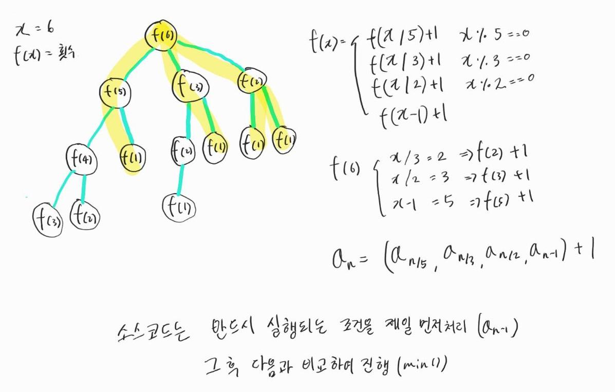 1을 빼는 연산을 제외하고는 해당 수로 나누어떨어질 때에 한해서만 점화식을 적용할 수 있다. 두 수 중 단순히 더 작은 수를 구하고자 할 때는 min() 함수를 이용한다.