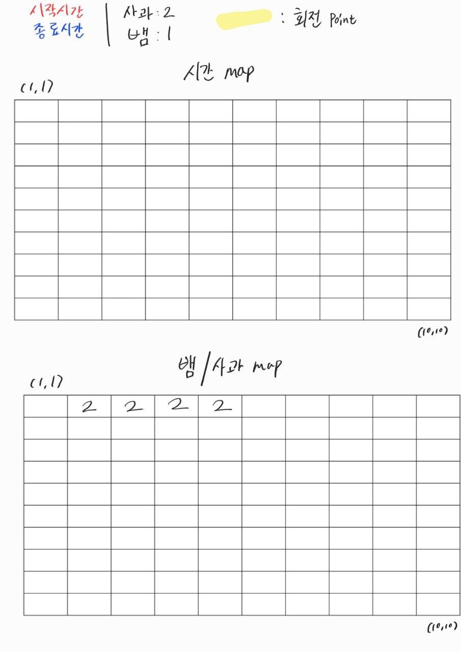 매 초마다 이동, 게임 시작 시간으로부터 X초가 끝난 뒤라고 제시되어 있다. - 그래서 (1,1)의 시작 시간은 0초, 종료 시간은 1초가 된다. 그리고 1초가 지났으니 이동하게 된다. (이 부분은 아래 그림으로 설명하겠다.)