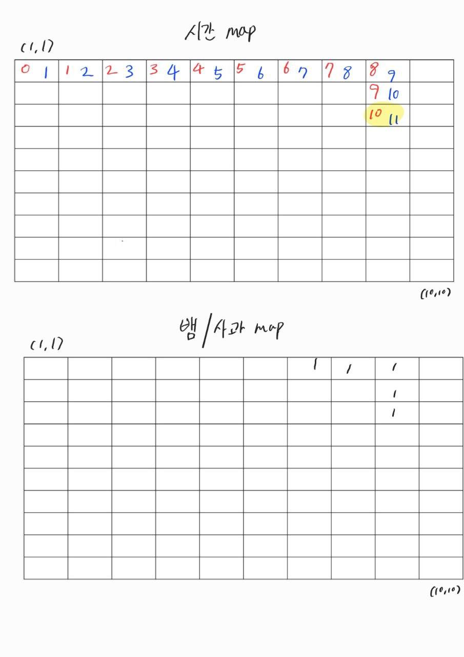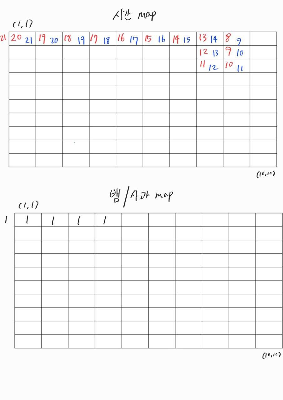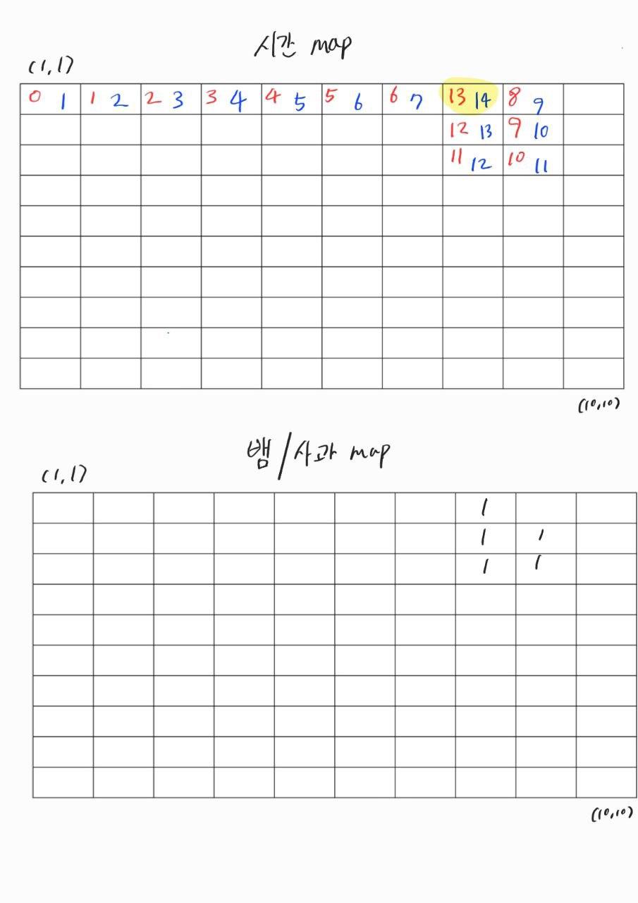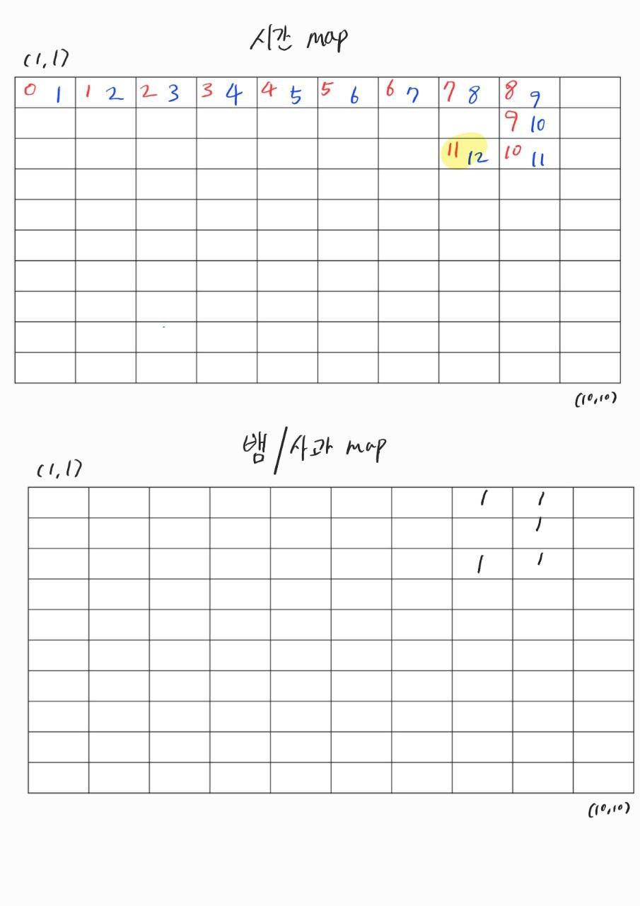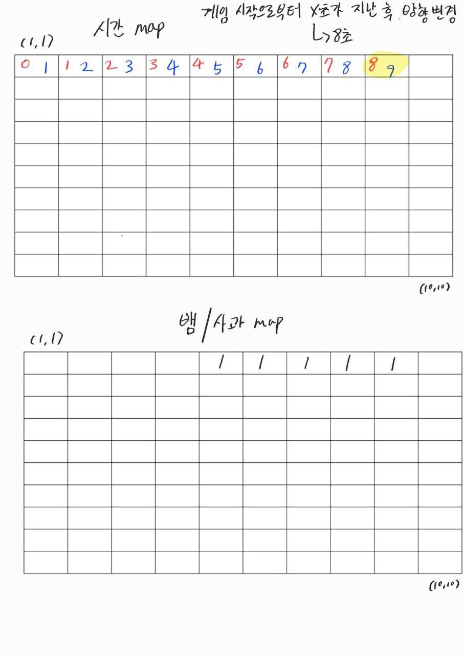 - 시간에 대한 문제 때문인데, (1,1)에서 뱀이 시작할 때를 1초로 잡고 구현했었다.